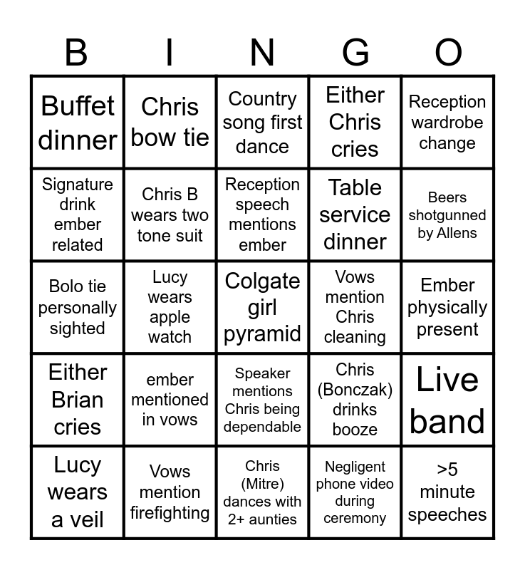 This bingo card has a free space and 24 words: ember mentioned in vows, Vows mention firefighting, Reception speech mentions ember, Lucy wears a veil, Reception wardrobe change, Buffet dinner, Signature drink ember related, Chris bow tie, Vows mention Chris cleaning, Speaker mentions Chris being dependable, Table service dinner, Bolo tie personally sighted, Chris (Bonczak) drinks booze, Live band, Chris B wears two tone suit, Negligent phone video during ceremony, Ember physically present, Country song first dance, Beers shotgunned by Allens, Lucy wears apple watch, >5 minute speeches, Either Brian cries, Either Chris cries and Chris (Mitre) dances with 2+ aunties.