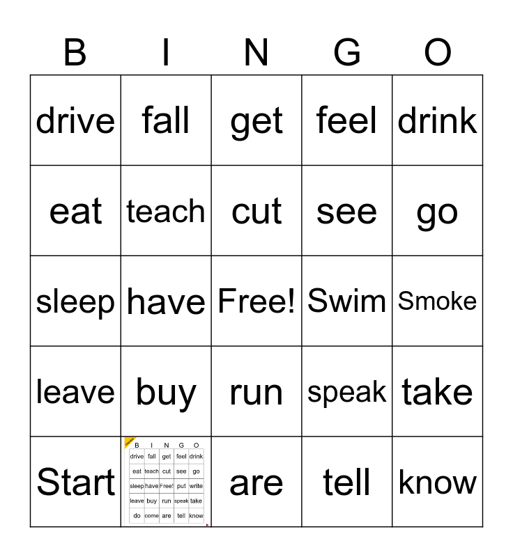 This bingo card has 1 images, a free space and 23 words: buy, cut, Start, drink, drive, eat, fall, Swim, run, see, sleep, speak, take, teach, tell, Smoke, get, go, have, know, leave, feel and are.