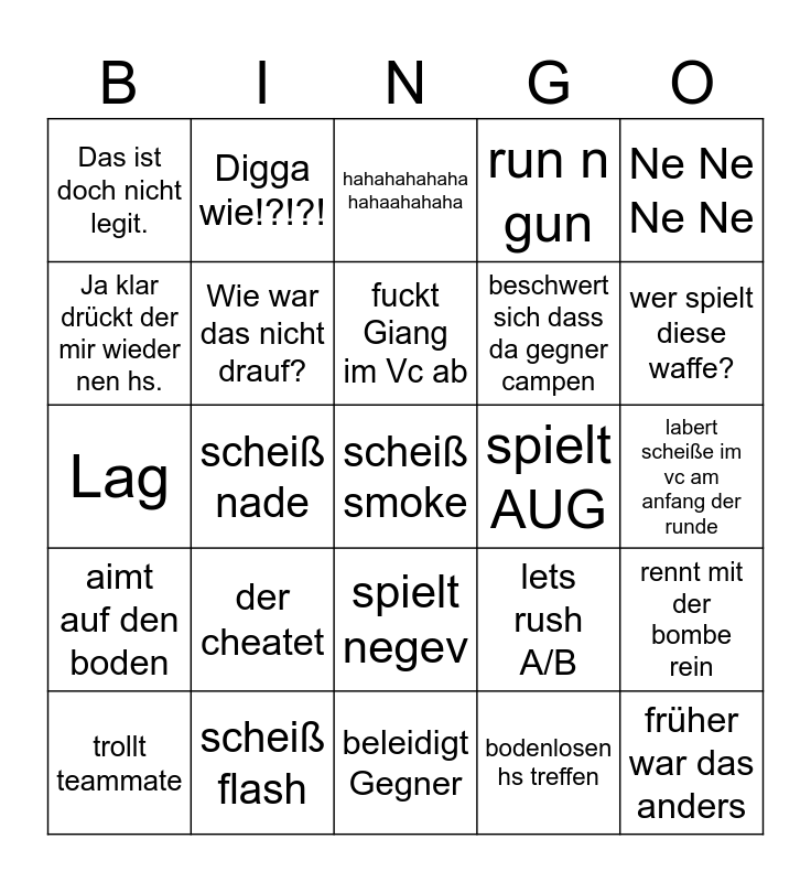 This bingo card has 25 words: der cheatet, beleidigt Gegner, fuckt Giang im Vc ab, trollt teammate, Ne Ne Ne Ne, Das ist doch nicht legit., Ja klar drückt der mir wieder nen hs., Digga wie!?!?!, spielt AUG, spielt negev, beschwert sich dass da gegner campen, Lag, lets rush A/B, rennt mit der bombe rein, Wie war das nicht drauf?, früher war das anders, labert scheiße im vc am anfang der runde, hahahahahaha hahaahahaha, wer spielt diese waffe?, scheiß nade, scheiß smoke, scheiß flash, aimt auf den boden, run n gun and bodenlosen hs treffen.