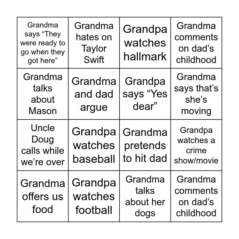 This bingo card has 24 words: Grandma comments on dad’s childhood, Grandma threatens to throw something at grandpa, Grandma says that’s she’s moving, Grandma tells a story she’s already told, Grandma talks about Mason, Grandma says “They were ready to go when they got here”, Grandma and dad argue, Grandma hates on Taylor Swift, Grandpa watches football, Grandma talks about being a nurse, Uncle Doug calls while we’re over, Grandma pretends to hit dad, Grandma cusses, Grandma says that she’s gonna get a dog, Grandpa says “Yes dear”, Grandma cracks an egg on our head, Grandma talks about her dogs, Grandpa watches hallmark, Grandpa watches baseball, Grandpa watches a crime show/movie, Grandma offers us food, Grandma comments on dad’s childhood, Grandma comments on dad’s childhood and Grandma comments on dad’s childhood.