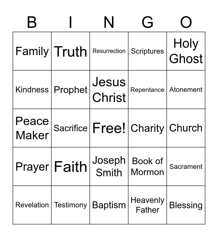 This bingo card has a free space and 24 words: Faith, Testimony, Jesus Christ, Revelation, Holy Ghost, Family, Kindness, Truth, Charity, Joseph Smith, Repentance, Peace Maker, Book of Mormon, Sacrament, Prophet, Heavenly Father, Church, Resurrection, Atonement, Sacrifice, Blessing, Prayer, Scriptures and Baptism.