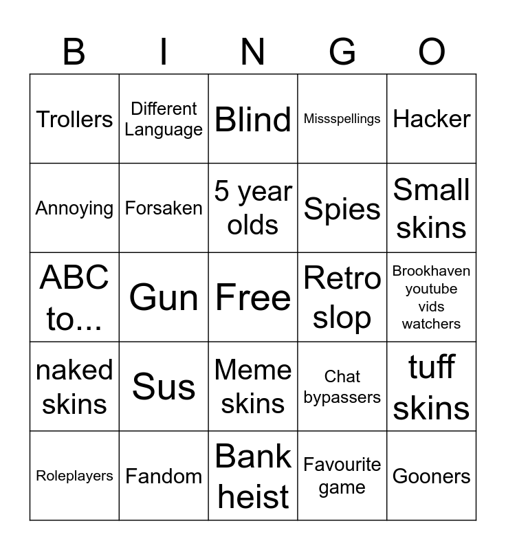 This bingo card has a free space and 24 words: Sus, Fandom, 5 year olds, Roleplayers, Hacker, Trollers, Annoying, Different Language, Retro slop, Meme skins, Spies, ABC to..., Chat bypassers, tuff skins, Forsaken, Favourite game, Brookhaven youtube vids watchers, Blind, Small skins, Gun, Gooners, naked skins, Missspellings and Bank heist.
