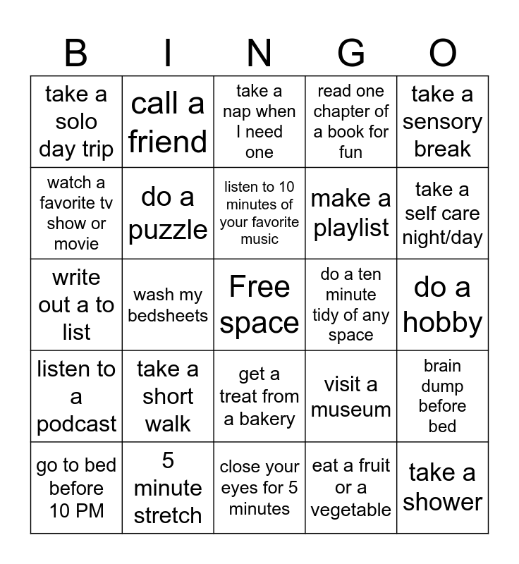 This bingo card has a free space and 24 words: take a short walk, 5 minute stretch, listen to 10 minutes of your favorite music, go to bed before 10 PM, take a sensory break, take a solo day trip, watch a favorite tv show or movie, call a friend, do a ten minute tidy of any space, get a treat from a bakery, make a playlist, write out a to list, visit a museum, brain dump before bed, do a puzzle, eat a fruit or a vegetable, do a hobby, take a nap when I need one, take a self care night/day, wash my bedsheets, take a shower, listen to a podcast, read one chapter of a book for fun and close your eyes for 5 minutes.
