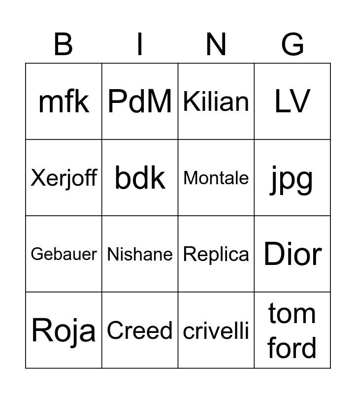 This bingo card has 16 words: Creed, Dior, Kilian, mfk, Gebauer, PdM, Replica, crivelli, Xerjoff, bdk, Roja, LV, Nishane, jpg, Montale and tom ford.