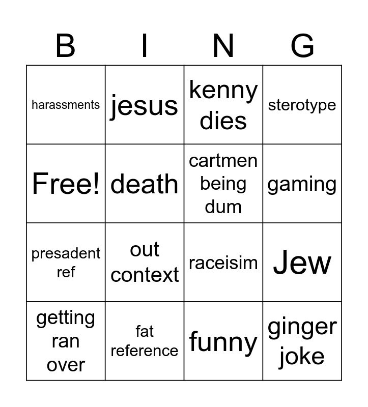 This bingo card has 16 words: fat reference, Jew, kenny dies, harassments, presadent ref, jesus, raceisim, funny, Free!, death, getting ran over, sterotype, out context, gaming, cartmen being dum and ginger joke.