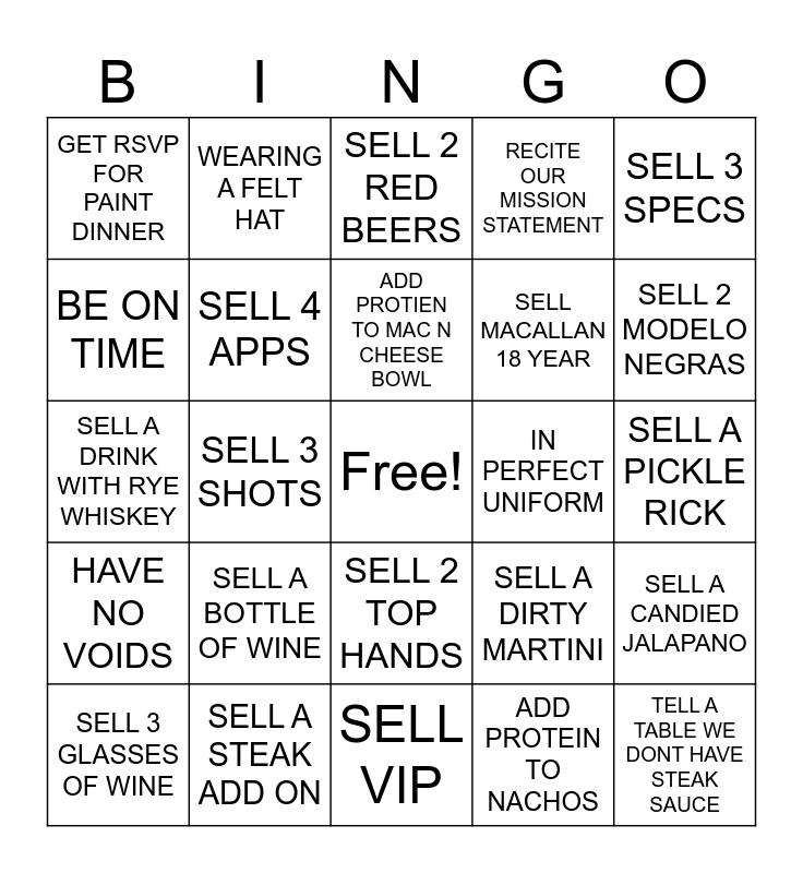 This bingo card has a free space and 24 words: SELL A BOTTLE OF WINE, SELL A STEAK ADD ON, ADD PROTIEN TO MAC N CHEESE BOWL, SELL 3 GLASSES OF WINE, SELL 3 SPECS, GET RSVP FOR PAINT DINNER, BE ON TIME, WEARING A FELT HAT, IN PERFECT UNIFORM, SELL 2 TOP HANDS, SELL MACALLAN 18 YEAR, SELL A DRINK WITH RYE WHISKEY, SELL A DIRTY MARTINI, SELL A CANDIED JALAPANO, SELL 4 APPS, ADD PROTEIN TO NACHOS, SELL A PICKLE RICK, SELL 2 RED BEERS, SELL 2 MODELO NEGRAS, SELL 3 SHOTS, TELL A TABLE WE DONT HAVE STEAK SAUCE, HAVE NO VOIDS, RECITE OUR MISSION STATEMENT and SELL VIP.