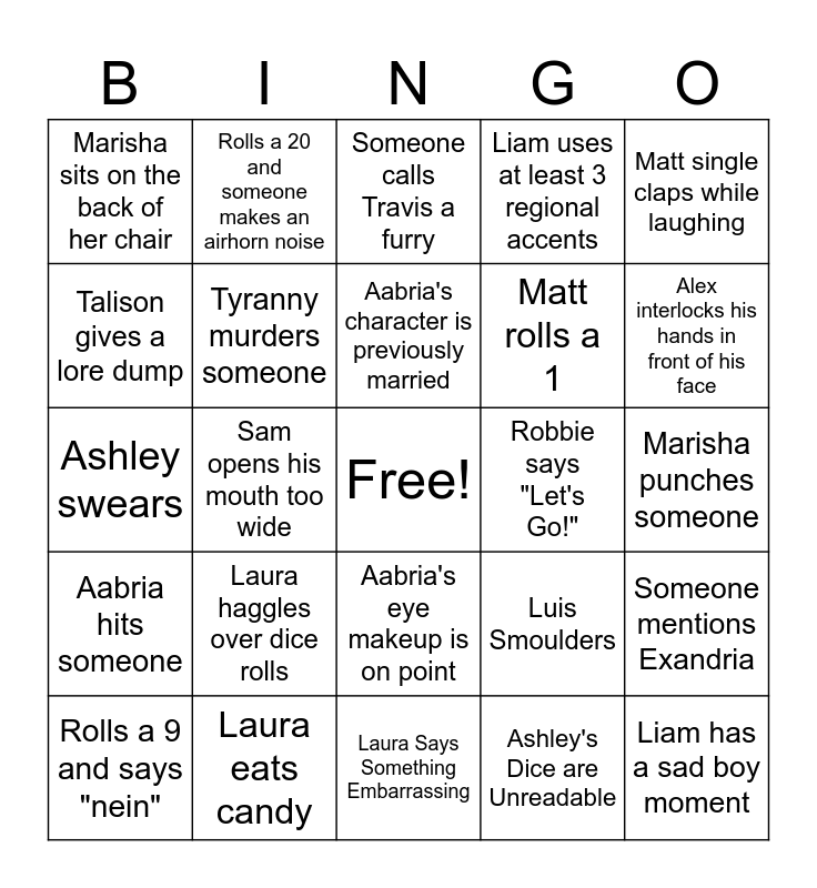 This bingo card has a free space and 31 words: Laura Says Something Embarrassing, Talesin says "something weird", Sam opens his mouth too wide, Brennan starts with a one word sentence, Marisha sits on the back of her chair, Someone calls Travis a furry, Tyranny murders someone, Luis Smoulders, Robbie says "Let's Go!", Ashley's Dice are Unreadable, Marisha punches someone, Liam has a sad boy moment, Sam says he doesn't know how to play D&D, Brennan spontaneously creates an amazing NPC, Alex interlocks his hands in front of his face, Brennan eats almonds, Someone mentions Exandria, Laura haggles over dice rolls, Aabria hits someone, Aabria's eye makeup is on point, Matt single claps while laughing, Player says a name wrong to make it dirty, Rolls a 9 and says "nein", Rolls a 20 and someone makes an airhorn noise, Matt rolls a 1, Talison gives a lore dump, Liam uses at least 3 regional accents, Ashley swears, Laura eats candy, Aabria's character is previously married and Ashley doesn't know the rules.