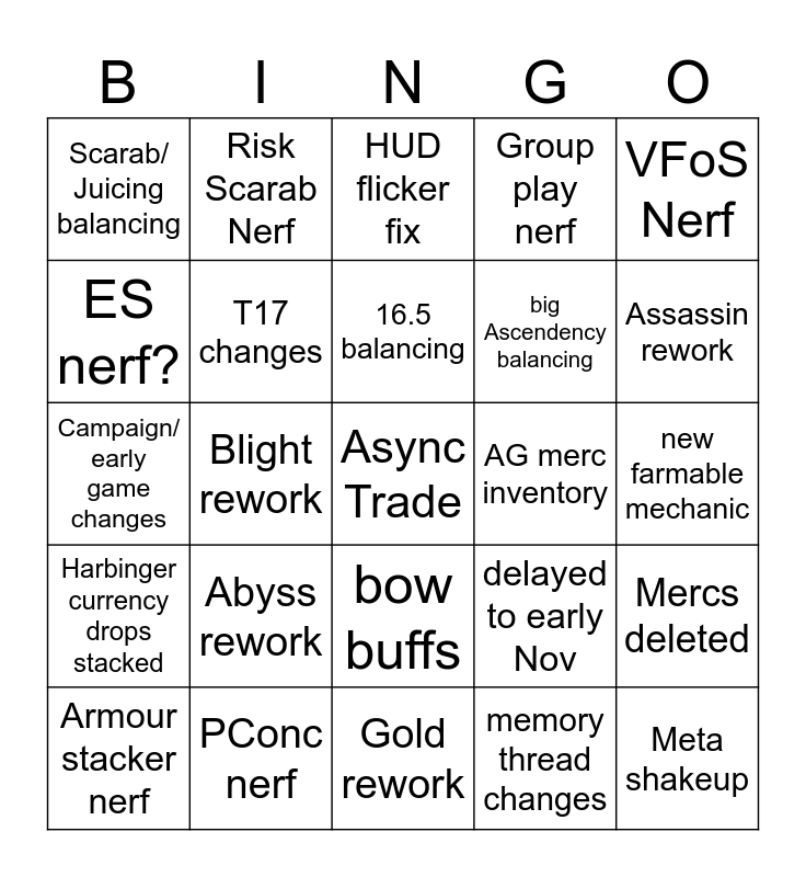 This bingo card has a free space and 24 words: Abyss rework, PConc nerf, 16.5 balancing, Armour stacker nerf, VFoS Nerf, Scarab/ Juicing balancing, ES nerf?, Risk Scarab Nerf, AG merc inventory, bow buffs, big Ascendency balancing, Campaign/ early game changes, delayed to early Nov, Mercs deleted, T17 changes, memory thread changes, new farmable mechanic, HUD flicker fix, Assassin rework, Blight rework, Meta shakeup, Harbinger currency drops stacked, Group play nerf and Gold rework.
