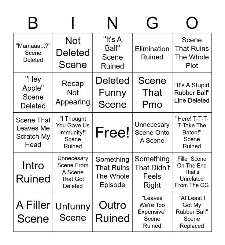 This bingo card has a free space and 24 words: Unnecesary Scene From A Scene That Got Deleted, Unfunny Scene, Deleted Funny Scene, A Filler Scene, Scene That Ruins The Whole Plot, ''Mamaaa...?'' Scene Deleted, ''Hey Apple'' Scene Deleted, Not Deleted Scene, Unnecesary Scene Onto A Scene, Something That Ruins The Whole Episode, Scene That Pmo, Scene That Leaves Me Scratch My Head, Something That Didn't Feels Right, Filler Scene On The End That's Unrelated From The OG, Recap Not Appearing, ''Leaves We're Too Expensive'' Scene Ruined, ''Here! T-T-T-T-Take The Baton!'' Scene Ruined, ''It's A Ball'' Scene Ruined, ''It's A Stupid Rubber Ball'' Line Deleted, ''I Thought You Gave Us Immunity!'' Scene Ruined, ''At Least I Got My Rubber Ball'' Scene Replaced, Intro Ruined, Elimination Ruined and Outro Ruined.