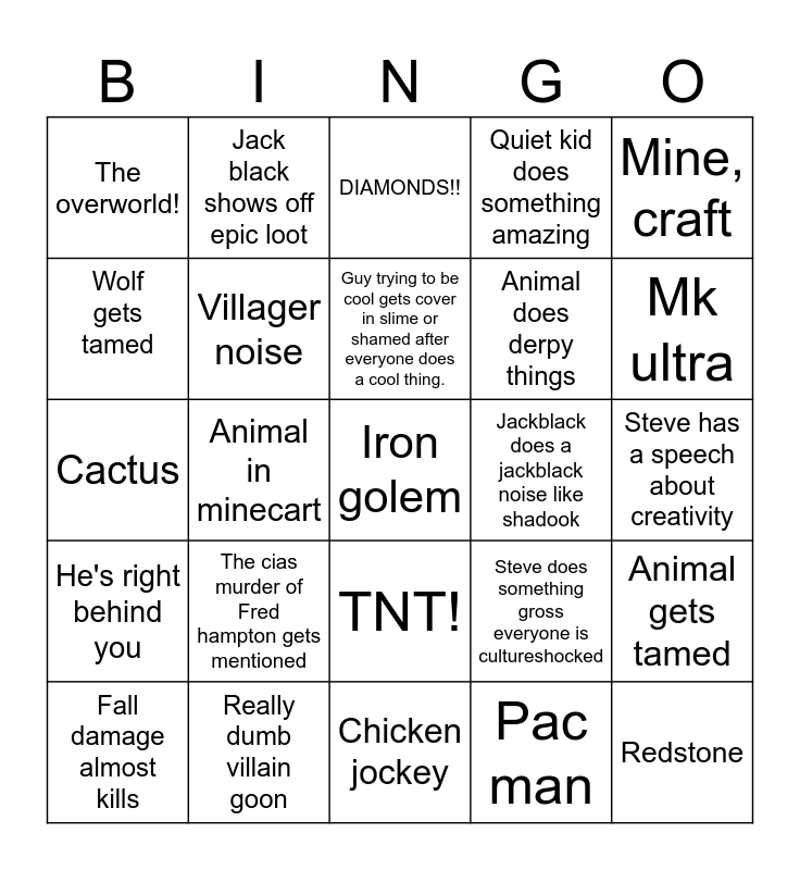This bingo card has 25 words: He's right behind you, Really dumb villain goon, Iron golem, Pac man, Mine, craft, The overworld!, Jack black shows off epic loot, DIAMONDS!!, Jackblack does a jackblack noise like shadook, Animal gets tamed, Wolf gets tamed, Villager noise, Chicken jockey, Steve does something gross everyone is cultureshocked, Mk ultra, Fall damage almost kills, Animal in minecart, Guy trying to be cool gets cover in slime or shamed after everyone does a cool thing., Animal does derpy things, Steve has a speech about creativity, Cactus, The cias murder of Fred hampton gets mentioned, TNT!, Quiet kid does something amazing and Redstone.
