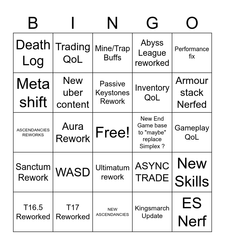 This bingo card has a free space and 24 words: WASD, T17 Reworked, Passive Keystones Rework, T16.5 Reworked, Performance fix, Death Log, Meta shift, Trading QoL, New End Game base to "maybe" replace Simplex ?, Ultimatum rework, Inventory QoL, ASCENDANCIES REWORKS, ASYNC TRADE, New Skills, New uber content, Kingsmarch Update, Gameplay QoL, Mine/Trap Buffs, Armour stack Nerfed, Aura Rework, ES Nerf, Sanctum Rework, Abyss League reworked and NEW ASCENDANCIES.
