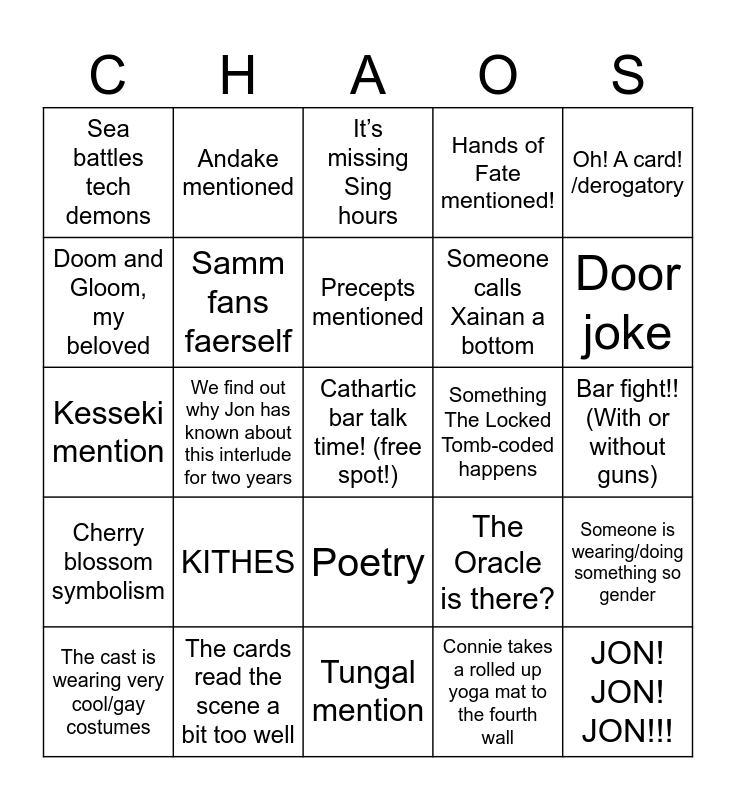 This bingo card has a free space and 44 words: ZO! ZO! ZO!!!!, JON! JON! JON!!!, New plane fit check!, The cast is wearing very cool/gay costumes, Connie takes a rolled up yoga mat to their own lore, Connie takes a rolled up yoga mat to the fourth wall, It’s missing Sing hours, Yay! A card! /pos, Oh! A card! /derogatory, The cards read the scene a bit too well, Hands of Fate mentioned!, Something The Locked Tomb-coded happens, Poetry, KITHES, The music is just too good, Tungal mention, Andake mention, Kesseki mention, Doom mention, Door joke, Andake mentioned, Connie is cooking up some good lore stew, Cat spotted! (seen/heard), Sea battles tech demons, Unreliable narration, my beloved, Bar fight!! (With or without guns), Patreon OC spotted!, Hot NPC spotted!, The Oracle is there?, Cherry blossom symbolism, Lesbians! Let’s go lesbians!, Someone is wearing/doing something so gender, Yeehaw mention, Hitchhiker spotted!, We find out why Jon has known about this interlude for two years, The overlay is so good!, Someone cries, Arc 4 game system reveal?, Precepts mentioned, Doom and Gloom, my beloved, Someone calls Xainan a bottom, Yummy food description, Samm fans faerself and Sea screams/ barks in chat /lh.