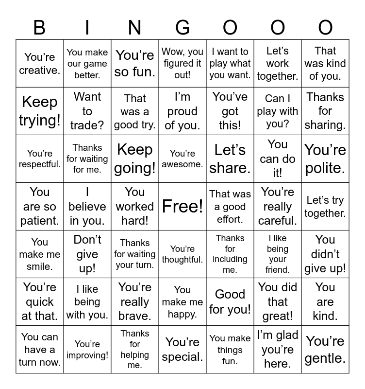 This bingo card has a free space and 99 words: You are a great friend., I like playing with you., You make me smile., You’re so fun., I like your drawing., You did a good job., You’re really good at that., I like your idea., Thank you for helping me., I like your toy., You make me laugh., You are smart., You are kind., You’re awesome., You’re really nice., You’re creative., You make our game better., You’re special., I like how you shared., You are cool., I like your smile., I’m glad you’re here., You’re really brave., You are strong., I like being your friend., You can do it!, Keep trying!, Don’t give up!, You’re getting better., Nice job trying., I believe in you., You worked hard!, You’re doing great., Good for you!, You’ve got this!, I’m proud of you., That was a good effort., You are learning., You didn’t give up!, Keep going!, You’re improving!, That was a good try., Wow, you figured it out!, You are so patient., You’re quick at that., You’re really careful., You’re so helpful., You remembered!, You’re getting stronger., You’re working hard!, Want to play with me?, Can I play with you?, Let’s share., Come sit with me., Let’s be partners., I’ll help you., Can you help me?, I’m glad you’re my friend., Want to build together?, Let’s try together., You can go first., Want to take turns?, I like being on your team., Want to make a game together?, You can join us., I want to play what you want., We can both choose., That’s a good idea—let’s do it!, I’m glad you’re here today., Thanks for waiting for me., You can have a turn now., Want to trade?, Let’s work together., Let’s do it your way., You did that great!, I forgive you., That was kind of you., You make me happy., I like being with you., You are fun to be around., Thanks for sharing., You’re a good listener., You’re a good partner., You’re thoughtful., Thanks for waiting your turn., That was fair., Thanks for helping me., You did something nice., You’re respectful., You’re polite., You make me feel good., You are a good teammate., You’re gentle., Thanks for being patient., You’re trustworthy., You have great ideas., Thanks for including me., You make things fun. and You’re a wonderful friend..