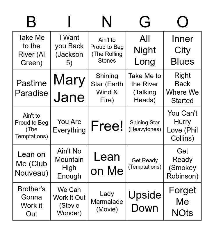 This bingo card has a free space and 49 words: Give it Up, Forget Me NOts, Lady Marmalade (LaBelle), Lady Marmalade (Movie), Ain't No Mountain High Enough, Land Of 1000 Dances, I Want you Back (Jackson 5), I Want You Back (Taylor Swift), Pastime Paradise, Got to Give it Up, Mary Jane, All Night Long, Get Ready (Smokey Robinson), Get Ready (Temptations), Easin' In, Machine Gun, Shining Star (Earth Wind & Fire), Shining Star (Heavytones), That Lady, Pts 1 & 2, Inner City Blues, You Are Everything, Upside Down, Take Me to the River (Al Green), Take Me to the River (Talking Heads), What's Going On, Right Back Where We Started, Brother's Gonna Work it Out, Papa Was a Rollin' Stone, Lean on Me, Lean on Me (Club Nouveau), Express Yourself, I Can't Help Myself, The Boss, Everyday People, We Can Work it Out (Stevie Wonder), We Can Work it Out (The Beatles), Sexual Healing, You Can't Hurry Love (The Supremes), You Can't Hurry Love (Phil Collins), Dancing in the Street, Easy (The Commadores), Easy (Faith No More), I Second That Emotion (Smokey Robinson & The Miracles), I Second That Emotion (Merl Saunders, Jerry Garcia), Ain't to Proud to Beg (The Temptations), Ain't to Proud to Beg (The Rolling Stones, How Sweet it IS (Marvin Gaye), Let's Get it ON and Let's Stay Together.