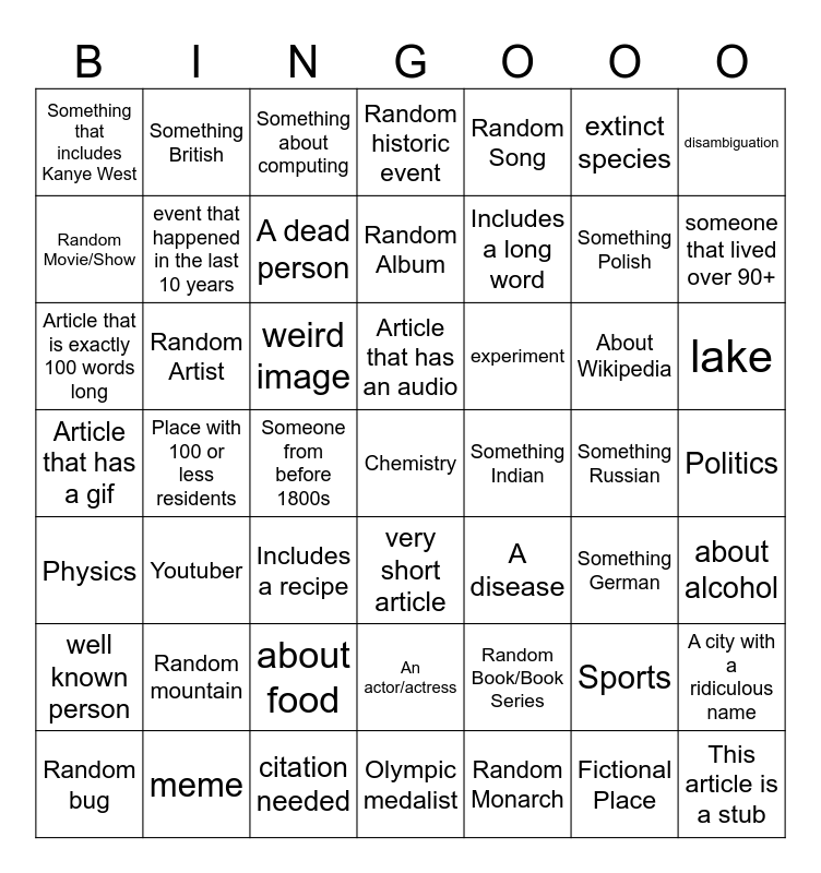 This bingo card has 49 words: Sports, Something Polish, Random Monarch, Place with 100 or less residents, weird image, Politics, Something British, citation needed, extinct species, very short article, disambiguation, Random historic event, About Wikipedia, experiment, Random mountain, Something Russian, Random Movie/Show, someone that lived over 90+, A city with a ridiculous name, Random Song, Includes a long word, Someone from before 1800s, Something that includes Kanye West, event that happened in the last 10 years, Random bug, A dead person, lake, meme, Article that has an audio, Random Artist, This article is a stub, Something Indian, well known person, about food, Article that has a gif, A disease, Something German, about alcohol, Article that is exactly 100 words long, Includes a recipe, An actor/actress, Physics, Chemistry, Olympic medalist, Random Album, Something about computing, Random Book/Book Series, Youtuber and Fictional Place.