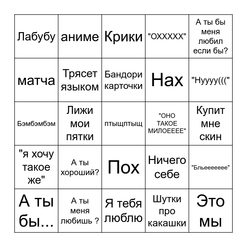 This bingo card has a free space and 24 words: А ты хороший?, А ты меня любишь ?, Бандори карточки, А ты бы..., А ты бы меня любил если бы?, Лабубу, матча, аниме, "ОНО ТАКОЕ МИЛОЕЕЕЕ", Пох, Нах, Бэмбэмбэм, Ничего себе, "Бльеееееее", Трясет языком, Шутки про какашки, Купит мне скин, Крики, "Нуууу(((", Лижи мои пятки, Это мы, "я хочу такое же", "ОХХХХХ" and Я тебя люблю.