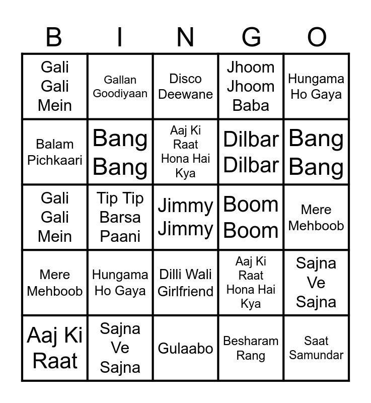 This bingo card has a free space and 58 words: Aaj Ki Raat, Sajna Ve Sajna, Janam Samjha Karo, Mere Mehboob, Besharam Rang, O Makhna Ve Makhna, Bang Bang, Ainveyi Ainveyi, Dilbar Dilbar, Uyi Amma, Jhoom Jhoom Baba, Raat baaki, Aapke Aajaane se, Om Shanti Om, Tip Tip Barsa Paani, Gali Gali Mein, Saat Samundar, Hungama Ho Gaya, Koi Kahe Kehta Rahe, Aaj Ki Raat Hona Hai Kya, Boom Boom, Disco Deewane, Aaj Ki Raat, Sajna Ve Sajna, Janam Samjha Karo, Mere Mehboob, Besharam Rang, O Makhna Ve Makhna, Bang Bang, Ainveyi Ainveyi, Dilbar Dilbar, Uyi Amma, Jhoom Jhoom Baba, Raat baaki, Jimmy Jimmy, Aapke Aajaane se, Om Shanti Om, Tip Tip Barsa Paani, Gali Gali Mein, Saat Samundar, Hungama Ho Gaya, Koi Kahe Kehta Rahe, Aaj Ki Raat Hona Hai Kya, Boom Boom, Disco Deewane, Suraj Dooba Hai, Humma Humma, Dilli Wali Girlfriend, Gulaabo, Zara Zara Behekta hai, London Thumakda, Kala Chashma, Piya Tu, Laila Main Laila, Gallan Goodiyaan, Tu Mera Hero, Balam Pichkaari and Sau Asmaanon Ko.
