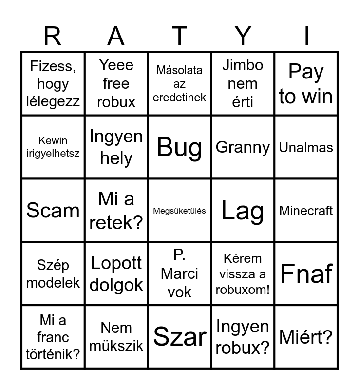 This bingo card has a free space and 29 words: Roblox?, Nem mükszik, Másolata az eredetinek, Borzalmas irányítás, Pay to win, Fizess, hogy lélegezz, Ingyen hely, Bug, Lag, Fnaf, Mi a franc történik?, Mi a retek?, Ingyen robux?, Miért?, Scam, Megérte, Szar, Kérem vissza a robuxom!, Unalmas, Szép modelek, Lopott dolgok, Szar modelek, Granny, Minecraft, Kewin irigyelhetsz, Yeee free robux, P. Marci vok, Jimbo nem érti and Fun.