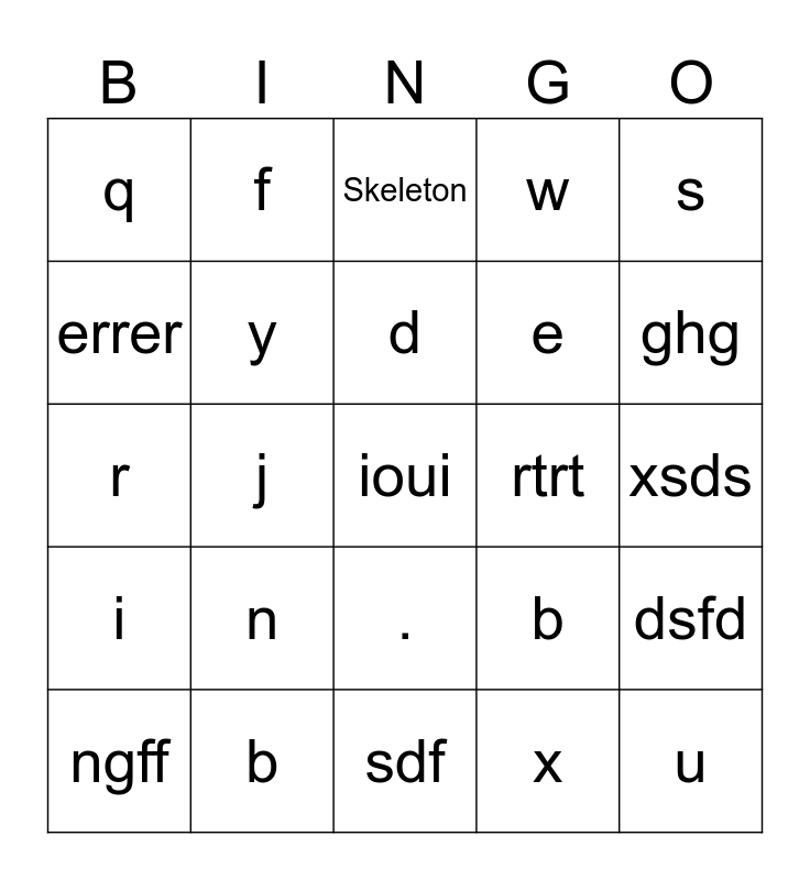 This bingo card has a free space and 24 words: n, b, d, ngff, s, q, errer, f, rtrt, ., e, r, b, dsfd, y, x, xsds, Skeleton, ghg, j, u, i, w and sdf.