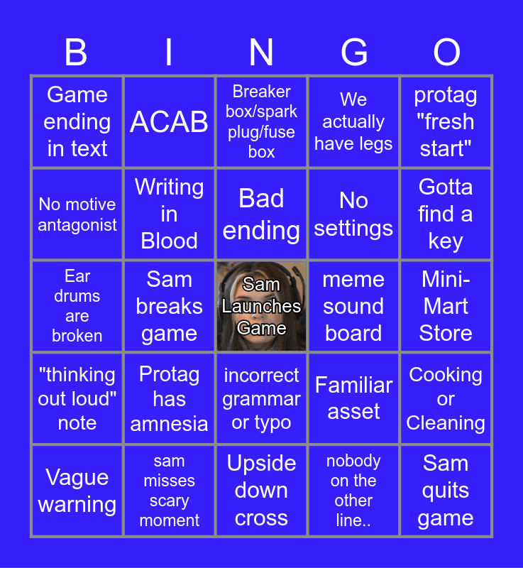 This bingo card has a free space and 29 words: Vague warning, slow walking speed, Sam breaks game, VHS Filter for no reason, Game ending in text, Breaker box/spark plug/fuse box, Writing in Blood, Protag has amnesia, meme sound board, sam misses scary moment, Mini- Mart Store, Sam quits game, Upside down cross, nobody on the other line.., Gotta find a key, AI Slop, incorrect grammar or typo, "thinking out loud" note, protag "fresh start", Ear drums are broken, Familiar asset, too dark cant see, No settings, No motive antagonist, We actually have legs, ACAB, Cooking or Cleaning, Bad ending and Content Creator Cameo.