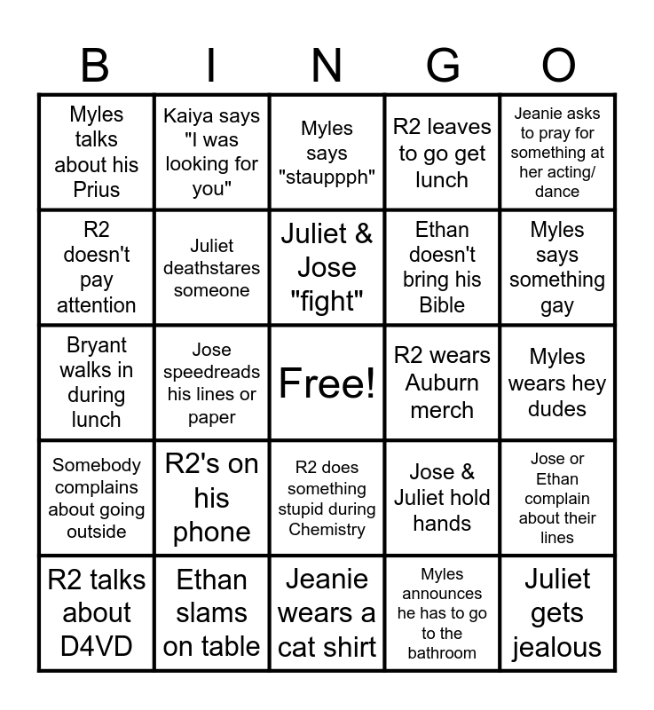 This bingo card has a free space and 24 words: R2 talks about D4VD, R2's on his phone, Juliet & Jose "fight", Myles announces he has to go to the bathroom, Jeanie asks to pray for something at her acting/ dance, Myles talks about his Prius, Kaiya says "I was looking for you", Myles says "stauppph", R2 wears Auburn merch, Myles wears hey dudes, Bryant walks in during lunch, Juliet deathstares someone, Jose & Juliet hold hands, Jose or Ethan complain about their lines, R2 doesn't pay attention, Ethan slams on table, Jeanie wears a cat shirt, R2 leaves to go get lunch, Myles says something gay, Somebody complains about going outside, Jose speedreads his lines or paper, R2 does something stupid during Chemistry, Ethan doesn't bring his Bible and Juliet gets jealous.