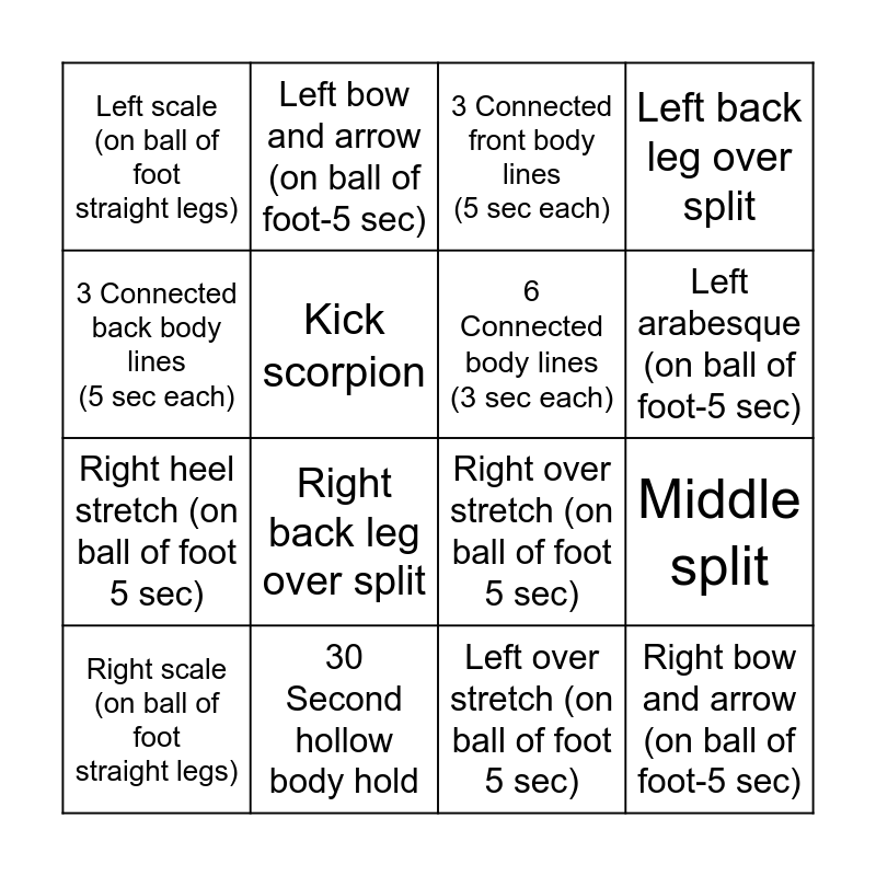 This bingo card has 16 words: 30 Second hollow body hold, Middle split, 3 Connected front body lines (5 sec each), Left scale (on ball of foot straight legs), Right heel stretch (on ball of foot 5 sec), Left bow and arrow (on ball of foot-5 sec), Right over stretch (on ball of foot 5 sec), Left over stretch (on ball of foot 5 sec), 3 Connected back body lines (5 sec each), Kick scorpion, Right scale (on ball of foot straight legs), Left back leg over split, Right back leg over split, Left arabesque (on ball of foot-5 sec), 6 Connected body lines (3 sec each) and Right bow and arrow (on ball of foot-5 sec).
