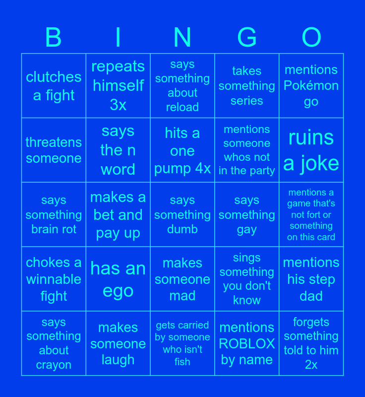 This bingo card has a free space and 24 words: has an ego, makes someone laugh, hits a one pump 4x, says something about crayon, mentions Pokémon go, clutches a fight, threatens someone, repeats himself 3x, says something gay, makes someone mad, mentions someone whos not in the party, says something brain rot, sings something you don't know, mentions his step dad, says the n word, mentions ROBLOX by name, mentions a game that's not fort or something on this card, says something about reload, ruins a joke, makes a bet and pay up, forgets something told to him 2x, chokes a winnable fight, takes something series and gets carried by someone who isn't fish.