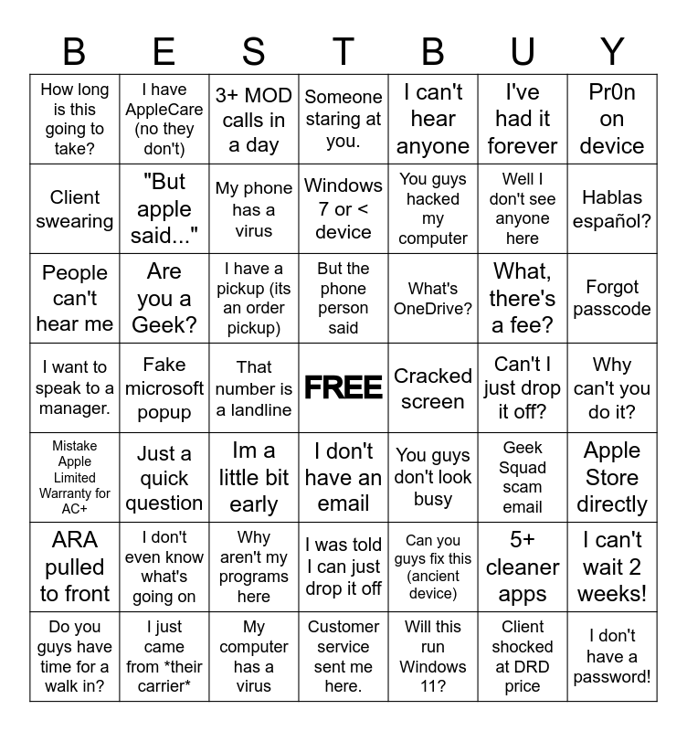 This bingo card has a free space and 69 words: I have GSP (no they don't), People can't hear me, My email stopped working, Geek Squad scam email, I want to speak to a manager., Im never shopping here again, Someone staring at you., I can't wait 2 weeks!, I can't hear anyone, But I live 30+ mins away, What, there's a fee?, My computer has a virus, How long is this going to take?, 3+ MOD calls in a day, Dirty device, You guys hacked my computer, But the phone person said, "But apple said...", "I don't have an appt.", Are you a Geek?, Hablas español?, What's OneDrive?, My phone has a virus, Can't I just drop it off?, Just a quick question, I was told I can just drop it off, I don't even know what's going on, Why aren't my programs here, That number is a landline, 5+ cleaner apps, I have AppleCare (no they don't), I just came from *their carrier*, I thought total covered it forever, I have total (no they don't), You guys don't look busy, I don't have an email, Customer service sent me here., Mistake Apple Limited Warranty for AC+, I've had it forever, I don't have a password!, I have a pickup (its an order pickup), Well I don't see anyone here, Why can't you do it?, Screen time passcode forgotten, Someone is changing my settings, Forgot passcode, Apple Store directly, Will this run Windows 11?, I wanna talk to corporate, Pr0n on device, Client swearing, Yapping client, Im a little bit early, Fake microsoft popup, Wave Browser on PC, I need an appointment for a pickup?, Poorly built gaming PC, Liquid damaged device, Cracked screen, Windows 7 or < device, I have AppleCare (has Asurion), 5+ RWB errors, Do you guys have time for a walk in?, ARA pulled to front, Can you guys fix this (ancient device), I shouldn't have a lot of data, Client shocked at DRD price, Phone won't charge (full of lint) and 30+ awaiting func check.