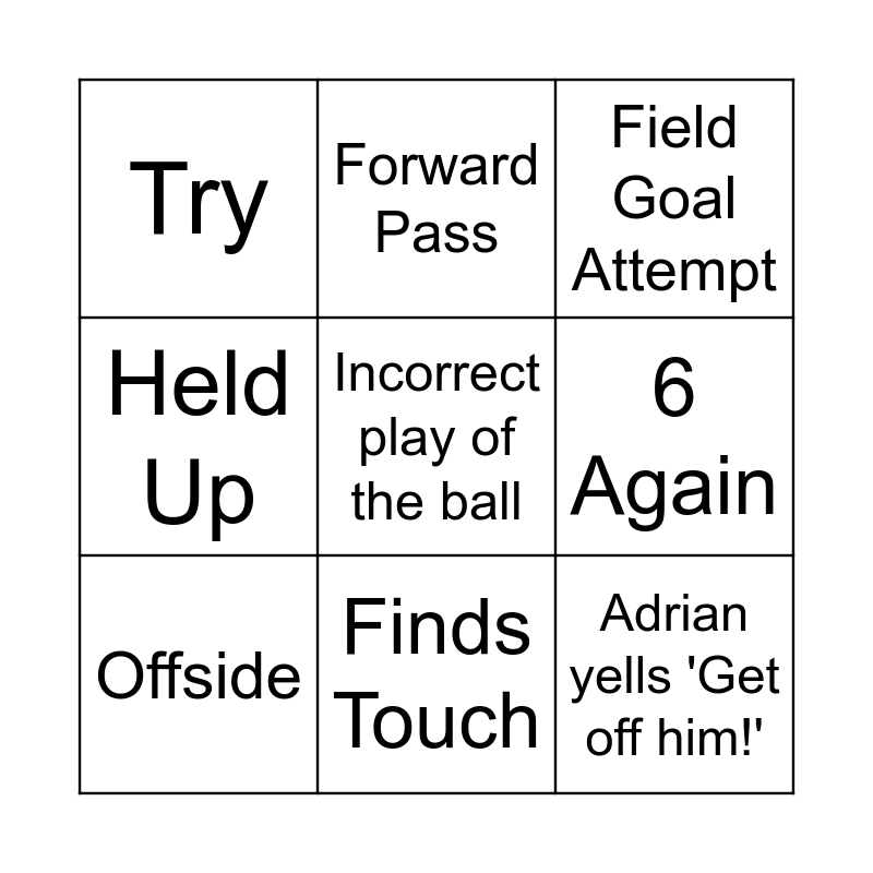 This bingo card has 9 words: Offside, Field Goal Attempt, Forward Pass, Held Up, Try, 6 Again, Incorrect play of the ball, Adrian yells 'Get off him!' and Finds Touch.