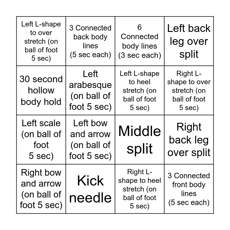 This bingo card has 16 words: Kick needle, Right back leg over split, 6 Connected body lines (3 sec each), Left L-shape to over stretch (on ball of foot 5 sec), Left scale (on ball of foot 5 sec), 3 Connected back body lines (5 sec each), Middle split, Right L-shape to heel stretch (on ball of foot 5 sec), 30 second hollow body hold, Left arabesque (on ball of foot 5 sec), Right bow and arrow (on ball of foot 5 sec), Left back leg over split, Left bow and arrow (on ball of foot 5 sec), Right L-shape to over stretch (on ball of foot 5 sec), Left L-shape to heel stretch (on ball of foot 5 sec) and 3 Connected front body lines (5 sec each).