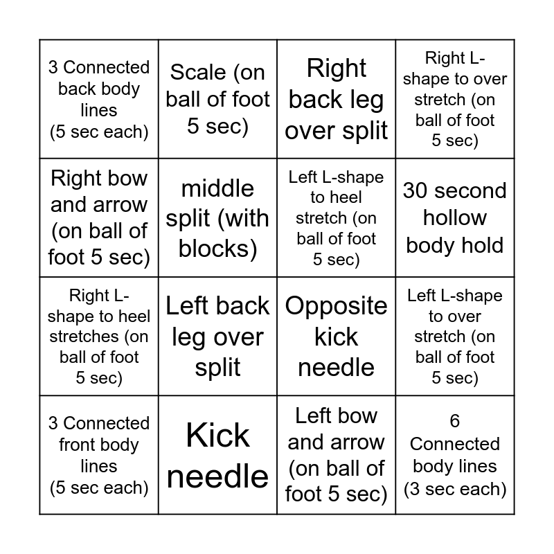 This bingo card has 16 words: Kick needle, Left L-shape to over stretch (on ball of foot 5 sec), Right back leg over split, 3 Connected back body lines (5 sec each), Right L-shape to heel stretches (on ball of foot 5 sec), Scale (on ball of foot 5 sec), Opposite kick needle, Left bow and arrow (on ball of foot 5 sec), Right bow and arrow (on ball of foot 5 sec), middle split (with blocks), 3 Connected front body lines (5 sec each), Right L-shape to over stretch (on ball of foot 5 sec), Left back leg over split, 30 second hollow body hold, Left L-shape to heel stretch (on ball of foot 5 sec) and 6 Connected body lines (3 sec each).