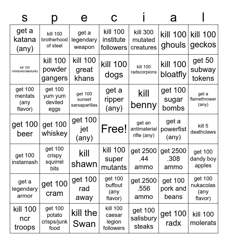 This bingo card has a free space and 76 words: get 25,000 caps, get a legendary armor, get a legendary weapon, get 2500 .556 ammo, get 2500 9mm ammo, get 2500 10mm ammo, get 2500 .308 ammo, get 2500 .357 ammo, get 2500 .44 ammo, get to lvl 20, kill 100 molerats, kill 100 radroaches, kill 100 mirelurks/lakelurks, kill 100 ghouls, kill 100 raiders, kill 100 radscorpions, kill 5 deathclaws, kill 100 bloatfly, kill 300 mutated insects, kill 300 mutated creatures, kill 100 super mutants, kill 100 dogs, kill 100 geckos, kill 100 brotherhood of steel, kill 100 institute followers, kill 100 caesar legion followers, kill 100 ncr troops, kill the Swan, kill caesar, kill house, kill shawn, kill 100 ants, kill kellogg, kill benny, kill 100 great khans, kill 100 powder gangers, get 100 stimpacks, get 25 super stimpacks, get 100 mentats (any flavor), get 100 jet (any), get 100 buffout (any flavor), get 100 rad away, get 100 radx, get 100 purified water, get 10 mini nukes, get an antimaterial rifle (any), get a flamethrower (any), get a katana (any), get an assault rifle (any), get a desert eagle (any), get a powerfist (any), get a ripper (any), get 100 phycho, get 100 dandy boy apples, get 100 salisbury steaks, get 100 fancy lads snack cakes, get 100 instamash, get 100 pork and beans, get 300 sodas (any), get 100 nukacolas (any flavor), get 100 sunset sarsaparillas, get 100 blamco mac and cheese, get 100 bubble gum/gum drops, get 100 dog food, get 500 bobby pins, get 100 cram, get 50 subway tokens, get 100 crispy squirrel bits, get 10 deathclaw eggs, get 100 potato crisps/junk food, get 100 sugar bombs, get 100 yum yum deviled eggs, get 100 beer, get 100 vodka, get 100 whiskey and get 100 wine.