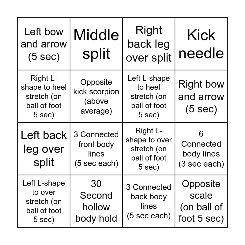 This bingo card has 16 words: 30 Second hollow body hold, 6 Connected body lines (3 sec each), Right back leg over split, Left bow and arrow (5 sec), Left back leg over split, Middle split, Right L-shape to over stretch (on ball of foot 5 sec), 3 Connected back body lines (5 sec each), Right L-shape to heel stretch (on ball of foot 5 sec), Opposite kick scorpion (above average), Left L-shape to over stretch (on ball of foot 5 sec), Kick needle, 3 Connected front body lines (5 sec each), Right bow and arrow (5 sec), Left L-shape to heel stretch (on ball of foot 5 sec) and Opposite scale (on ball of foot 5 sec).