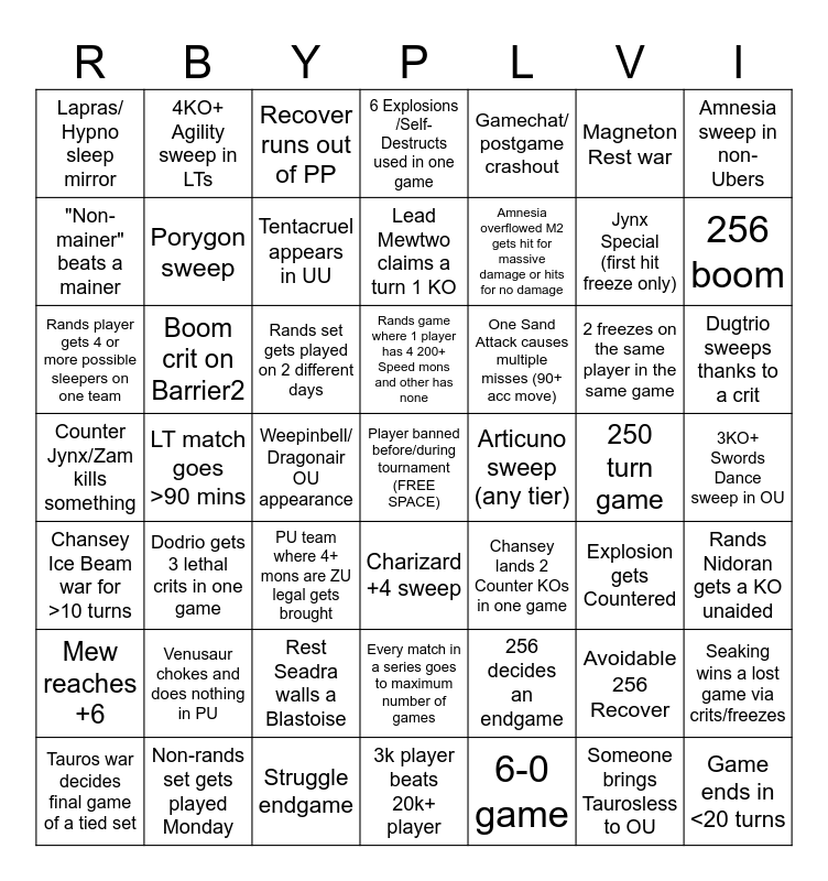 This bingo card has a free space and 48 words: 256 decides an endgame, Jynx Special (first hit freeze only), 3k player beats 20k+ player, LT match goes >90 mins, Rands set gets played on 2 different days, 3KO+ Swords Dance sweep in OU, 4KO+ Agility sweep in LTs, Non-rands set gets played Monday, Magneton Rest war, Charizard +4 sweep, Amnesia sweep in non-Ubers, 6 Explosions /Self-Destructs used in one game, 2 freezes on the same player in the same game, One Sand Attack causes multiple misses (90+ acc move), Mew reaches +6, 250 turn game, "Non-mainer" beats a mainer, 256 boom, Avoidable 256 Recover, Gamechat/ postgame crashout, Amnesia overflowed M2 gets hit for massive damage or hits for no damage, Weepinbell/ Dragonair OU appearance, Lapras/ Hypno sleep mirror, Porygon sweep, Seaking wins a lost game via crits/freezes, Tentacruel appears in UU, Dugtrio sweeps thanks to a crit, Tauros war decides final game of a tied set, Rands game where 1 player has 4 200+ Speed mons and other has none, Boom crit on Barrier2, Someone brings Taurosless to OU, Articuno sweep (any tier), Rands Nidoran gets a KO unaided, Venusaur chokes and does nothing in PU, Counter Jynx/Zam kills something, Chansey lands 2 Counter KOs in one game, Explosion gets Countered, Rands player gets 4 or more possible sleepers on one team, PU team where 4+ mons are ZU legal gets brought, Rest Seadra walls a Blastoise, Chansey Ice Beam war for >10 turns, Game ends in <20 turns, Recover runs out of PP, Struggle endgame, Lead Mewtwo claims a turn 1 KO, Every match in a series goes to maximum number of games, Dodrio gets 3 lethal crits in one game and 6-0 game.