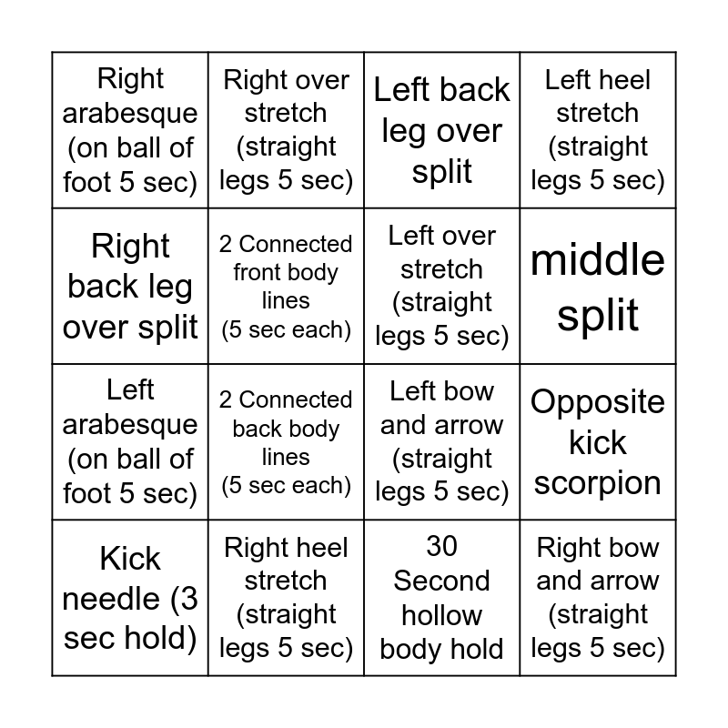 This bingo card has 16 words: Right heel stretch (straight legs 5 sec), Opposite kick scorpion, Left back leg over split, Right arabesque (on ball of foot 5 sec), Left arabesque (on ball of foot 5 sec), Right over stretch (straight legs 5 sec), Left bow and arrow (straight legs 5 sec), 30 Second hollow body hold, Right back leg over split, 2 Connected front body lines (5 sec each), Kick needle (3 sec hold), Left heel stretch (straight legs 5 sec), 2 Connected back body lines (5 sec each), middle split, Left over stretch (straight legs 5 sec) and Right bow and arrow (straight legs 5 sec).