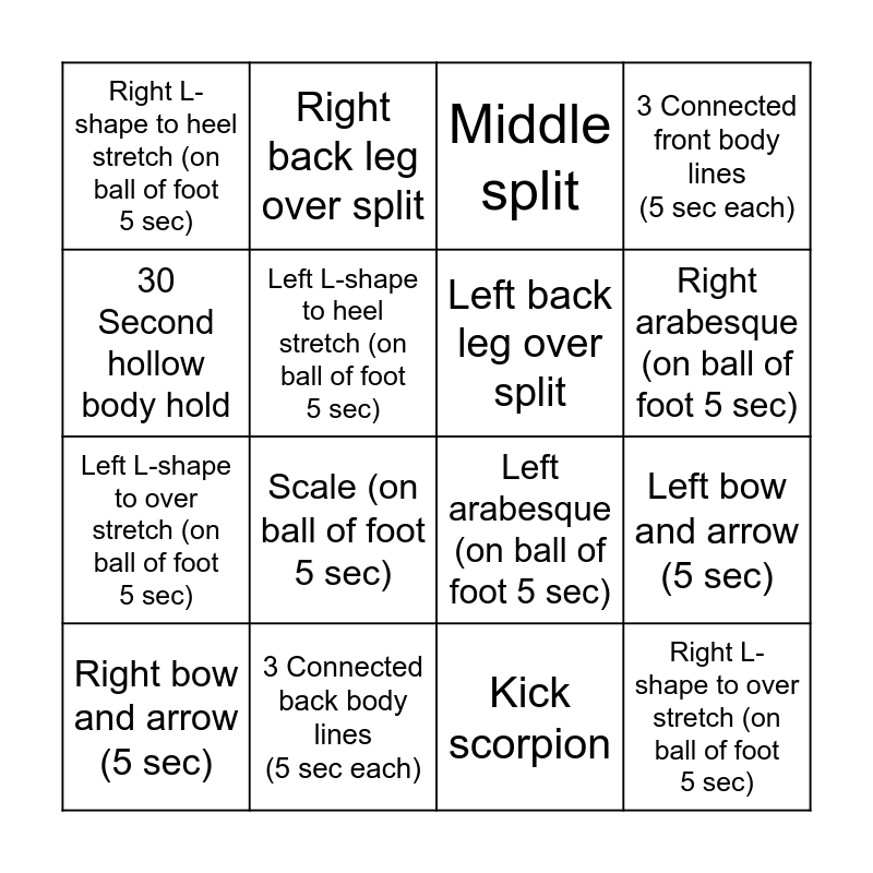 This bingo card has 16 words: 3 Connected back body lines (5 sec each), Left bow and arrow (5 sec), Middle split, Right L-shape to heel stretch (on ball of foot 5 sec), Left L-shape to over stretch (on ball of foot 5 sec), Right back leg over split, Left arabesque (on ball of foot 5 sec), Kick scorpion, 30 Second hollow body hold, Left L-shape to heel stretch (on ball of foot 5 sec), Right bow and arrow (5 sec), 3 Connected front body lines (5 sec each), Scale (on ball of foot 5 sec), Right arabesque (on ball of foot 5 sec), Left back leg over split and Right L-shape to over stretch (on ball of foot 5 sec).