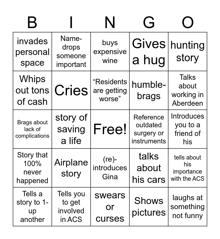 This bingo card has a free space and 24 words: Airplane story, Tells you to get involved in ACS, “Residents are getting worse”, Tells a story to 1-up another, hunting story, invades personal space, Whips out tons of cash, Name-drops someone important, Reference outdated surgery or instruments, (re)-introduces Gina, humble-brags, Brags about lack of complications, talks about his cars, tells about his importance with the ACS, Cries, Shows pictures, Introduces you to a friend of his, buys expensive wine, Talks about working in Aberdeen, story of saving a life, laughs at something not funny, Story that 100% never happened, Gives a hug and swears or curses.