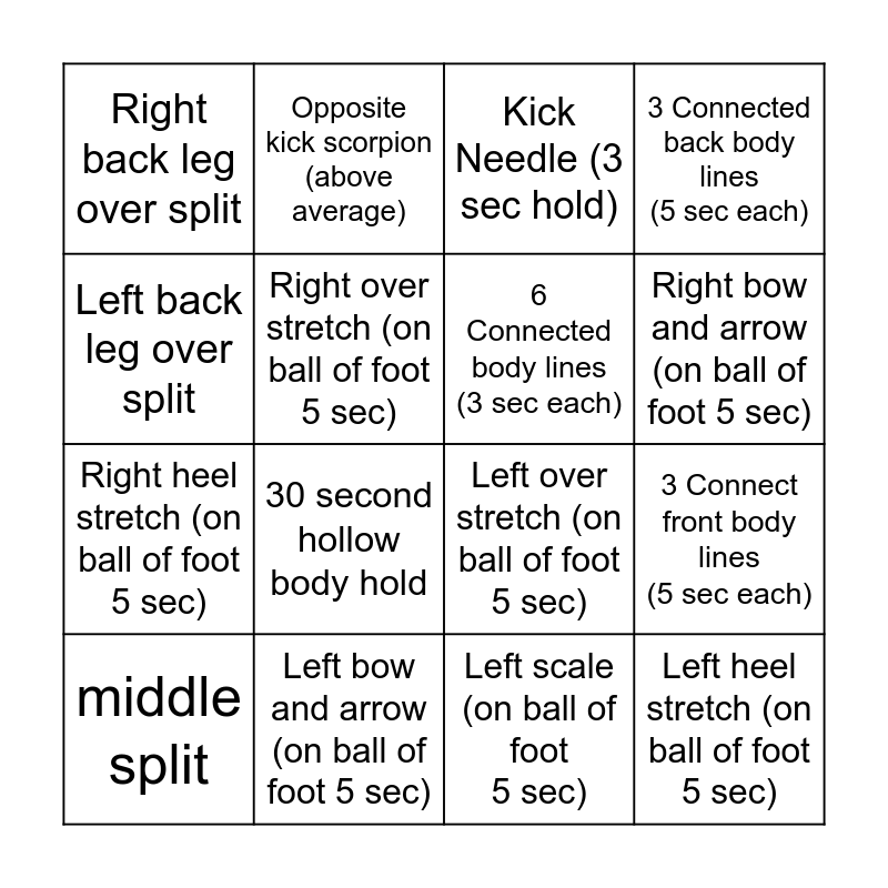 This bingo card has 16 words: Left bow and arrow (on ball of foot 5 sec), 3 Connect front body lines (5 sec each), Kick Needle (3 sec hold), Right back leg over split, Right heel stretch (on ball of foot 5 sec), Opposite kick scorpion (above average), Left over stretch (on ball of foot 5 sec), Left scale (on ball of foot 5 sec), Left back leg over split, Right over stretch (on ball of foot 5 sec), middle split, 3 Connected back body lines (5 sec each), 30 second hollow body hold, Right bow and arrow (on ball of foot 5 sec), 6 Connected body lines (3 sec each) and Left heel stretch (on ball of foot 5 sec).