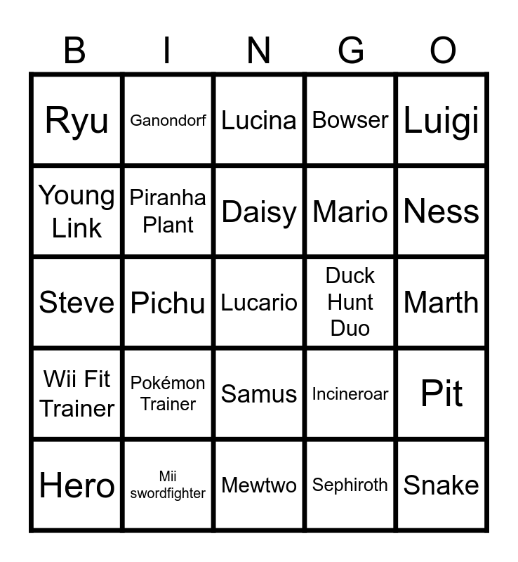 This bingo card has a free space and 24 words: Pokémon Trainer, Mii swordfighter, Daisy, Hero, Luigi, Ryu, Young Link, Ganondorf, Duck Hunt Duo, Samus, Mario, Steve, Incineroar, Pit, Piranha Plant, Sephiroth, Marth, Lucina, Ness, Pichu, Snake, Wii Fit Trainer, Bowser and Mewtwo.