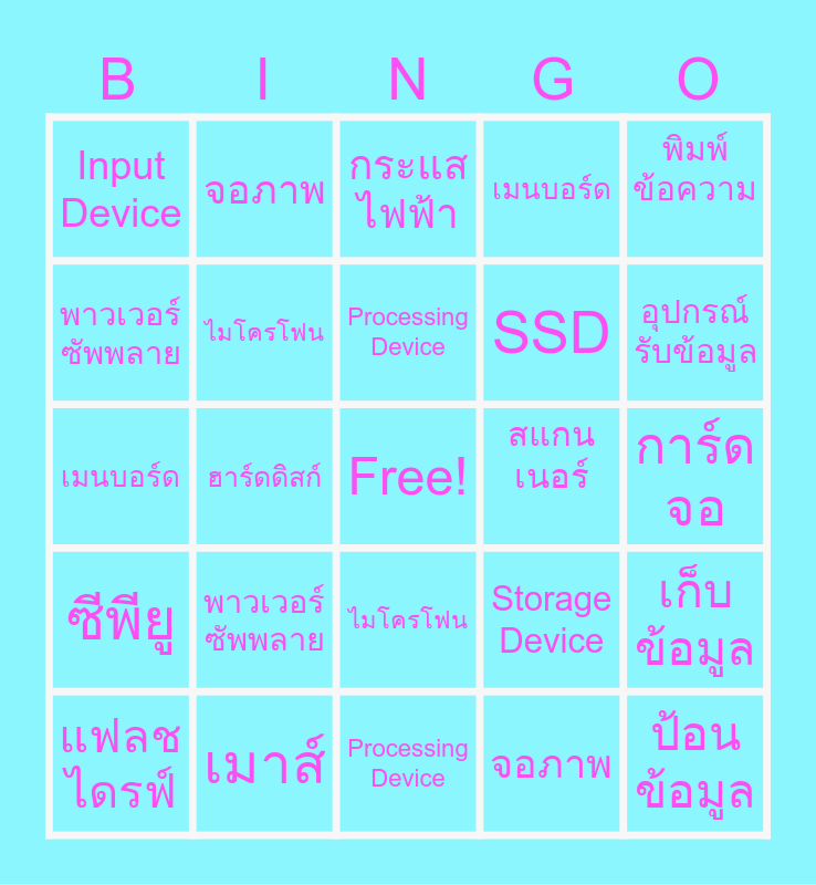 This bingo card has a free space and 59 words: ฮาร์ดแวร์, เมาส์, คีย์บอร์ด, ซีพียู, จอภาพ, ลำโพง, ไมโครโฟน, อุปกรณ์จัดเก็บข้อมูล, SSD, ฮาร์ดดิสก์, เมนบอร์ด, เคส, พาวเวอร์ซัพพลาย, การ์ดจอ, แรม (RAM), Input Device, ป้อนข้อมูล, พิมพ์ข้อความ, หน่วยประมวลผลกลาง, Processing Device, สแกนเนอร์, กระแสไฟฟ้า, แฟลชไดรฟ์, เก็บข้อมูล, อุปกรณ์คอมพิวเตอร์, ส่วนประกอบ, ระบบคอมพิวเตอร์, ฮาร์ดแวร์, อุปกรณ์รับข้อมูล, คีย์บอร์ด, เมาส์, อุปกรณ์ประมวลผล, CPU, อุปกรณ์แสดงผล, จอภาพ, ลำโพง, อุปกรณ์จัดเก็บข้อมูล, ฮาร์ดดิสก์, SSD, เมนบอร์ด, เคส, พาวเวอร์ซัพพลาย, การ์ดจอ, แรม (RAM), Input Device, ป้อนข้อมูล, พิมพ์ข้อความ, สแกนเนอร์, ไมโครโฟน, Processing Device, หน่วยประมวลผลกลาง, หน่วยความจำชั่วคราว, Output Device, แสดงผลลัพธ์, พรินเตอร์, Storage Device, เก็บข้อมูล, แฟลชไดรฟ์ and กระแสไฟฟ้า.