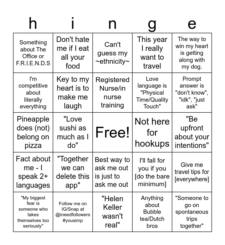 This bingo card has a free space and 24 words: "Together we can delete this app", Follow me on IG/Snap at @ineedfollowers #yousimp, Registered Nurse/in nurse training, "My biggest fear is someone who takes themselves too seriously", The way to win my heart is getting along with my dog., Something about The Office or F.R.I.E.N.D.S, I'm competitive about literally everything, Don't hate me if I eat all your food, Not here for hookups, Best way to ask me out is just to ask me out, Love language is "Physical Time/Quality Touch", Pineapple does (not) belong on pizza, I'll fall for you if you [do the bare minimum], Give me travel tips for [everywhere], Key to my heart is to make me laugh, Anything about Bubble tea/Dutch bros, "Be upfront about your intentions", Can't guess my ~ethnicity~, Prompt answer is "don't know", "idk", "just ask", "Love sushi as much as I do", "Someone to go on spontaneous trips together", Fact about me - I speak 2+ languages, This year I really want to travel and "Helen Keller wasn't real".