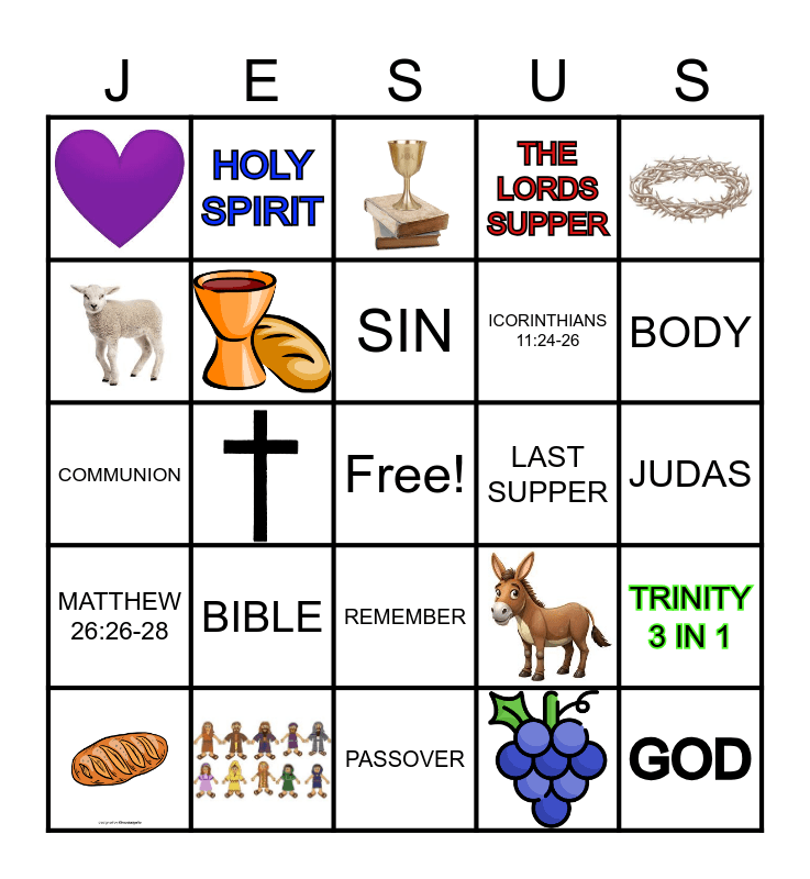 This bingo card has 13 images, a free space and 16 words: JESUS, BIBLE, LAST SUPPER, JUDAS, GOD, PASSOVER, BODY, BLOOD, REMEMBER, MATTHEW 26:26-28, COMMUNION, ICORINTHIANS 11:24-26, THE LORDS SUPPER, HOLY SPIRIT, TRINITY 3 IN 1 and SIN.