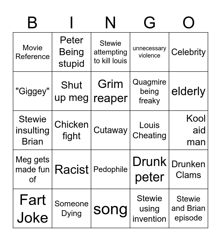 This bingo card has a free space and 24 words: Racist, Someone Dying, Grim reaper, Fart Joke, Celebrity, Movie Reference, "Giggey", Peter Being stupid, Louis Cheating, Pedophile, Quagmire being freaky, Stewie insulting Brian, Drunk peter, Drunken Clams, Shut up meg, Stewie using invention, Kool aid man, Stewie attempting to kill louis, elderly, Chicken fight, Stewie and Brian episode, Meg gets made fun of, unnecessary violence and song.