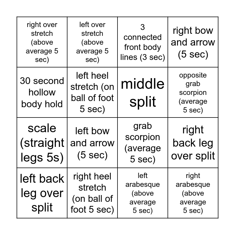 This bingo card has 16 words: right heel stretch (on ball of foot 5 sec), right back leg over split, 3 connected front body lines (3 sec), right over stretch (above average 5 sec), scale (straight legs 5s), left over stretch (above average 5 sec), grab scorpion (average 5 sec), left arabesque (above average 5 sec), 30 second hollow body hold, left heel stretch (on ball of foot 5 sec), left back leg over split, right bow and arrow (5 sec), left bow and arrow (5 sec), opposite grab scorpion (average 5 sec), middle split and right arabesque (above average 5 sec).