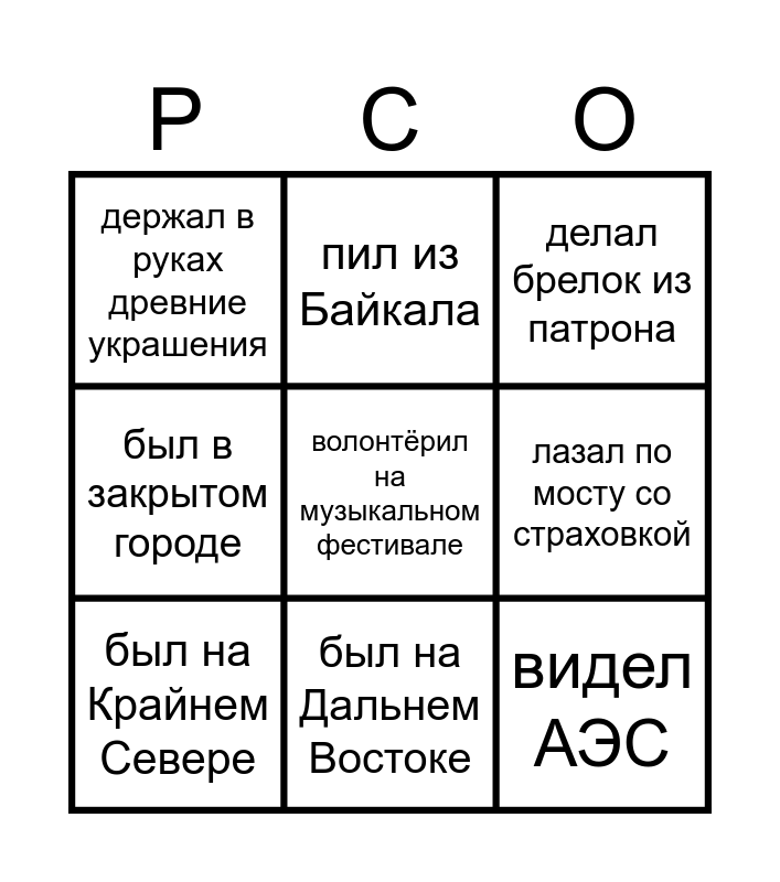 This bingo card has a free space and 8 words: лазал по мосту со страховкой, делал брелок из патрона, пил из Байкала, был на Крайнем Севере, держал в руках древние украшения, видел АЭС, был в закрытом городе and был на Дальнем Востоке.