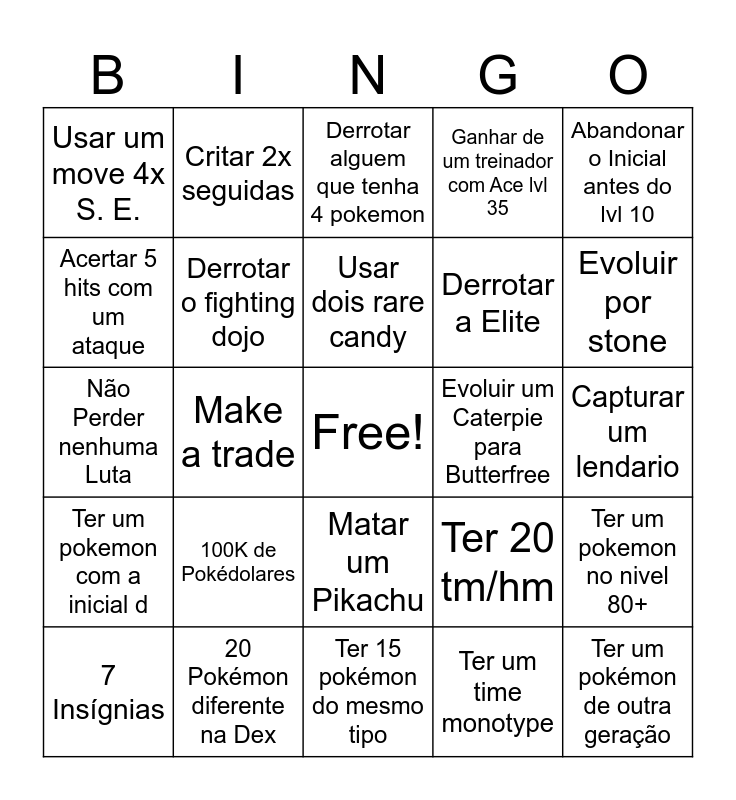 This bingo card has a free space and 24 words: 100K de Pokédolares, 20 Pokémon diferente na Dex, Usar dois rare candy, 7 Insígnias, Abandonar o Inicial antes do lvl 10, Usar um move 4x S. E., Acertar 5 hits com um ataque, Critar 2x seguidas, Evoluir um Caterpie para Butterfree, Matar um Pikachu, Derrotar a Elite, Não Perder nenhuma Luta, Ter 20 tm/hm, Ter um pokemon no nivel 80+, Derrotar o fighting dojo, Ter um time monotype, Capturar um lendario, Derrotar alguem que tenha 4 pokemon, Evoluir por stone, Make a trade, Ter um pokémon de outra geração, Ter um pokemon com a inicial d, Ganhar de um treinador com Ace lvl 35 and Ter 15 pokémon do mesmo tipo.