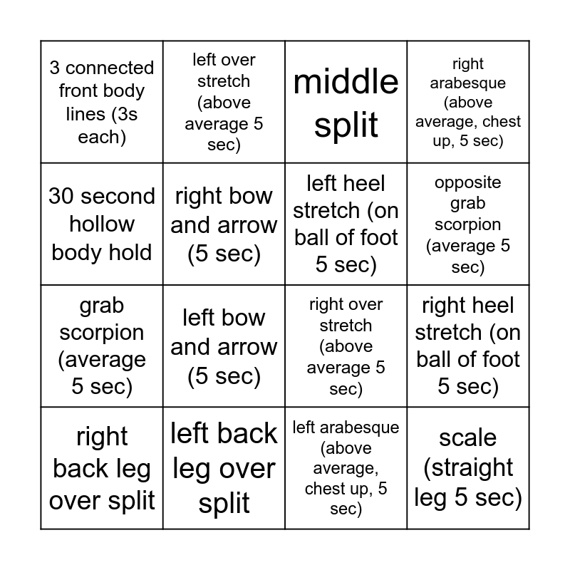 This bingo card has 16 words: left back leg over split, right heel stretch (on ball of foot 5 sec), middle split, 3 connected front body lines (3s each), grab scorpion (average 5 sec), left over stretch (above average 5 sec), right over stretch (above average 5 sec), left arabesque (above average, chest up, 5 sec), 30 second hollow body hold, right bow and arrow (5 sec), right back leg over split, right arabesque (above average, chest up, 5 sec), left bow and arrow (5 sec), opposite grab scorpion (average 5 sec), left heel stretch (on ball of foot 5 sec) and scale (straight leg 5 sec).