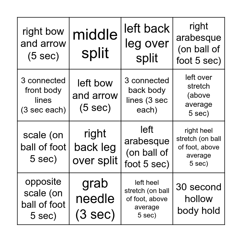 This bingo card has 16 words: grab needle (3 sec), right heel stretch (on ball of foot, above average 5 sec), left back leg over split, right bow and arrow (5 sec), scale (on ball of foot 5 sec), middle split, left arabesque (on ball of foot 5 sec), left heel stretch (on ball of foot, above average 5 sec), 3 connected front body lines (3 sec each), left bow and arrow (5 sec), opposite scale (on ball of foot 5 sec), right arabesque (on ball of foot 5 sec), right back leg over split, left over stretch (above average 5 sec), 3 connected back body lines (3 sec each) and 30 second hollow body hold.