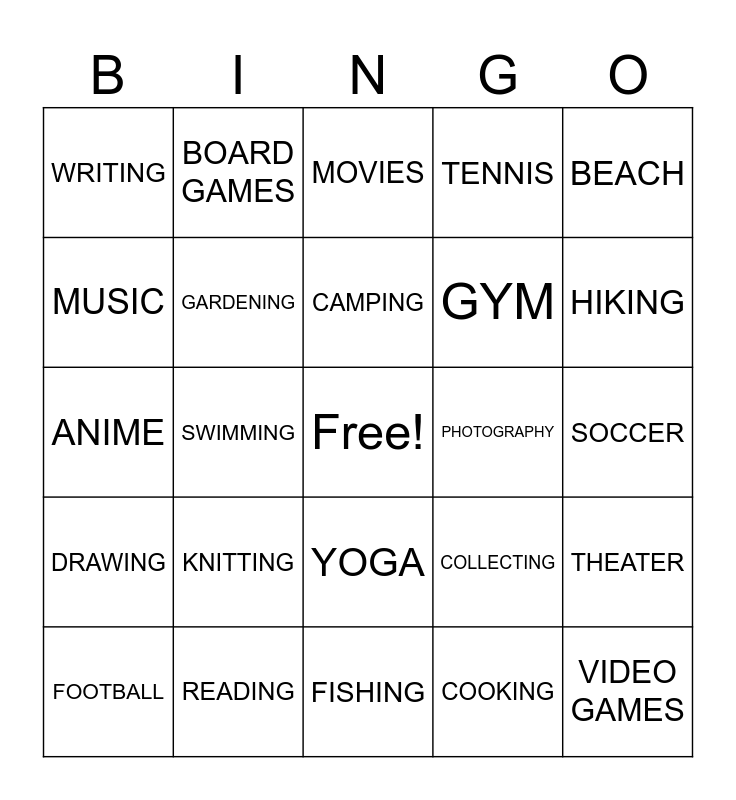 This bingo card has a free space and 24 words: KNITTING, READING, CAMPING, FOOTBALL, BEACH, WRITING, MUSIC, BOARD GAMES, PHOTOGRAPHY, YOGA, GYM, ANIME, COLLECTING, THEATER, GARDENING, COOKING, SOCCER, MOVIES, HIKING, SWIMMING, VIDEO GAMES, DRAWING, TENNIS and FISHING.