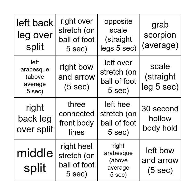 This bingo card has 16 words: right heel stretch (on ball of foot 5 sec), 30 second hollow body hold, opposite scale (straight legs 5 sec), left back leg over split, right back leg over split, right over stretch (on ball of foot 5 sec), left heel stretch (on ball of foot 5 sec), right arabesque (above average 5 sec), left arabesque (above average 5 sec), right bow and arrow (5 sec), middle split, grab scorpion (average), three connected front body lines, scale (straight leg 5 sec), left over stretch (on ball of foot 5 sec) and left bow and arrow (5 sec).